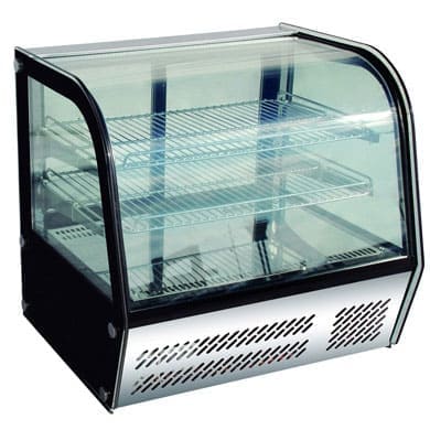 Витрина кондитерская Gastrorag в аренду G160, температурный режим от +3 +12 градусов, длина 856 мм, для установки на стол или тумбу, динамическое охлаждение, высота 670 мм, ширина 856 мм, глубина 568 мм, светодиодная подсветка, черный корпус, электронная панель управления, сзади 2 раздвижные стеклянные дверцы, фронтальное стекло выгнутое, хромированные полки-решетки верхняя 820x372 мм